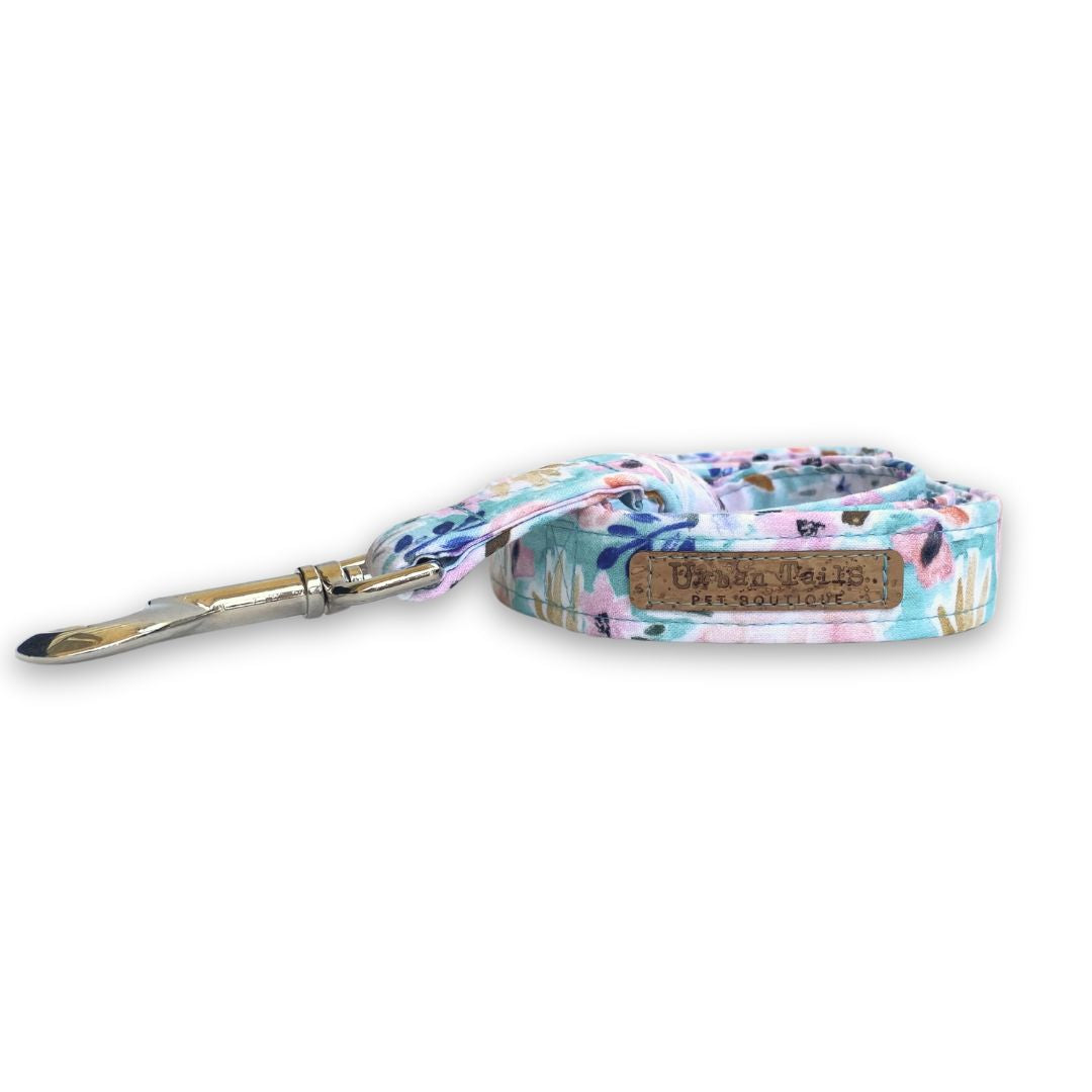 Enjoy effortless walks with the Seafoam Meadow Dog Leash, designed for style, strength, and comfort. Featuring a soft watercolor floral print on a minty green-blue base, this leash is both functional and fashionable. A sturdy silver metal clasp provides secure leash attachment, while reinforced stitching ensures lasting durability.